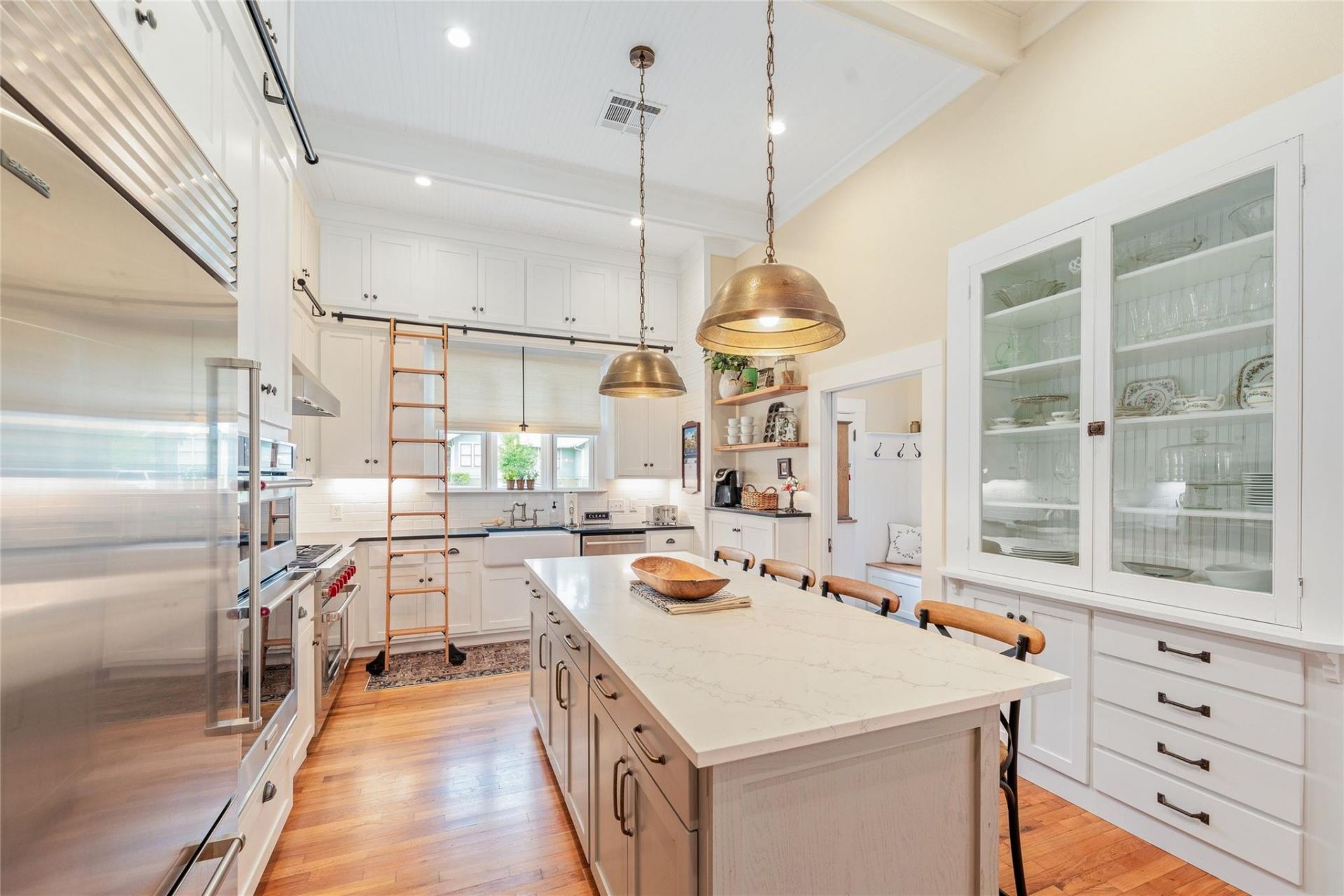 TIMELESS LEGACY. MODERN PRECISION. WALK TO THE SQUARE.The Frank Marrs Home?built in 1891, meticulously restored from the ground up in 2018?is one of Georgetowns most extraordinary residences. The Frank Marrs Home reflects the legacy of an early Georgetown family believed to have been connected to the towns dry goods and mercantile trade, contributing to its growth as a thriving center of commerce and community. Perched on a half-acre hilltop corner lot with heritage trees in the heart of Old Town, this single-story home blends 133 years of soul with everything modern living demands. Step inside to soaring 12-foot ceilings and original repurposed pine shiplap that frame every room with character you cant build new. Reclaimed oak hardwood floors flow through an open, sun-filled floor plan designed for both grand entertaining and quiet everyday living. The chefs kitchen centers on a spacious island beneath two-story custom cabinetry with a rolling library ladder?flanked by a Wolf gas range, Sub-Zero refrigerator, and Bosch dishwasher. A wood-burning stone fireplace with custom built-in cabinets anchors the living space. The primary retreat features transom windows, a clawfoot soaking tub, a separate glass-enclosed shower, and an etched lead glass window. A sunroom adorned with doors from a historic Waco home invites serene views of the yard. A built-in storm shelter adds peace of mind. Four bedrooms. Three bathrooms. Every room on one level. No stairs. No compromises. No HOA. Walk to San Gabriel Park. Walk to the river. Walk to the Most Beautiful Town Square in Texas. This is the home that doesnt exist anywhere else in Georgetown.